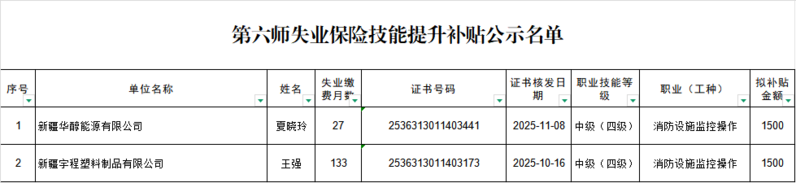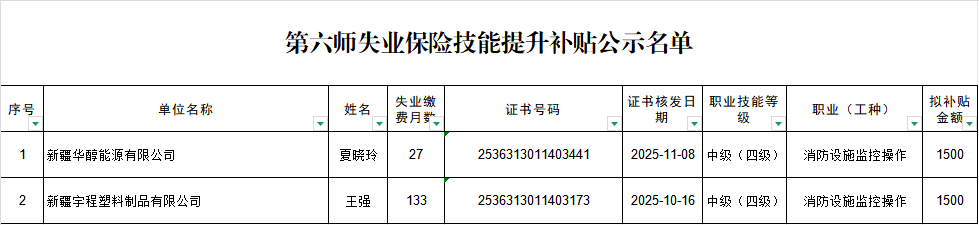 根据《关于失业保险支持参保职工提升职业技能有关问题的通知》(兵人社发〔2017〕152号)精神,经第六师社会保险事业管理中心审核,现将拟享受失业保险技能提升补贴人员进行公示,接受社会各界监督。公示时间为2025年12月15日至2025年12月19日,为期5天。公示期间,如有认为公示对象不符合条件的,可以通过来电、来访方式实名反映情况。