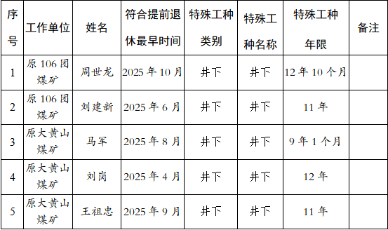 根据特殊工种提前退休有关工作要求,现对特殊工种提前退休申报合格人员进行公示,公示期限5个工作日(自 2025年12月25日至 2025年12月31日),如有异议,请在公示期内向兵师人力资源和社会保障局举报。本公示不作为特殊工种提前退休最终审核结果。