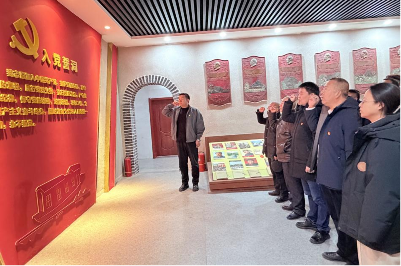 在党史陈列区的鲜红党旗下,105团7连党支部书记张策带领全体党员庄严站立,举起右拳重温入党誓词。“我志愿加入中国共产党,拥护党的纲领,遵守党的章程……”铿锵有力的誓言在展厅内久久回荡,既是对革命先辈的深情回望,也是对初心使命的庄严承诺。党员们神情肃穆,目光坚定,紧握的拳头彰显着对党忠诚、为共产主义事业奋斗终身的决心。