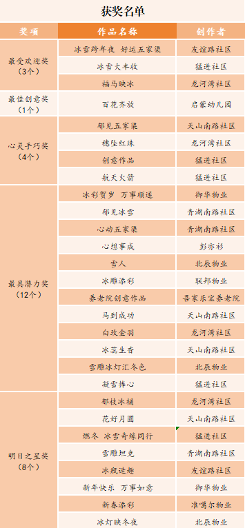 你们用奇思妙想为这个冬天增添了独特的冰雪魅力。 同时,也感谢所有参赛选手的积极参与,每一件作品都展现了大家对生活的热爱和对冰雪艺术的创意表达。 公示期间,如对结果有异议,请及时向青湖路街道党群服务中心反映。