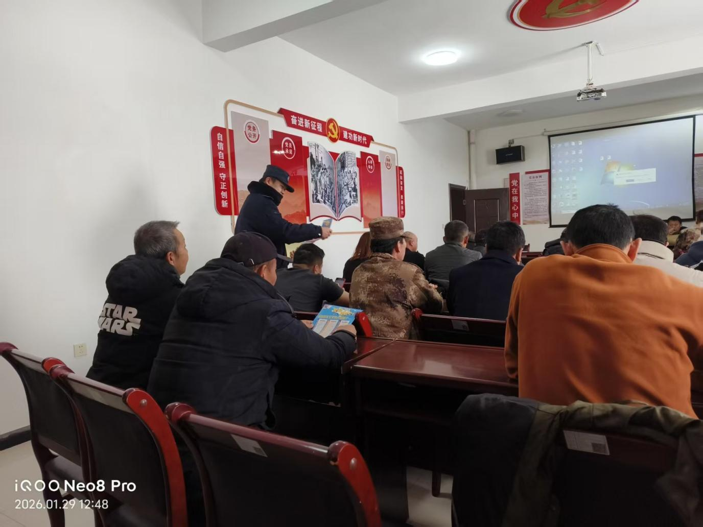 会议现场,警务站辅警结合近期高发的电信诈骗案例,用“以案说法” 的方式,生动讲解网络刷单返利、虚假购物退款、冒充公检法人员办案等常见诈骗手段。辅警细致拆解诈骗分子的话术套路,重点提醒老年居民切勿轻信陌生来电和短信,不随意泄露个人身份证号、银行卡信息,不向陌生账户转账汇款,遇到可疑情况及时拨打110或联系社区工作人员核实,并现场指导居民安装“国家反诈中心App”,筑牢反诈“第一道防线”。