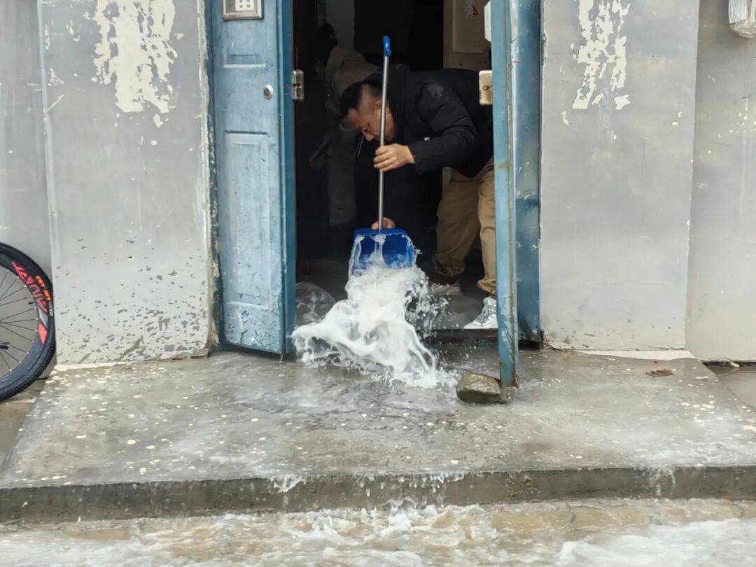 为彻底消除出行隐患,社区工作人员拿起扫帚、铁锹、融雪剂分工协作,奋力清扫楼道积水,将积水扫进排水口, 反复清扫,不放过一处积水、不留下一处安全隐患,经过近1小时连续奋战,楼道与路面积水、冰层全部清理完毕,出行安全隐患彻底消除。随后物业工作人员完成破损管道更换与加固,小区恢复正常供水。