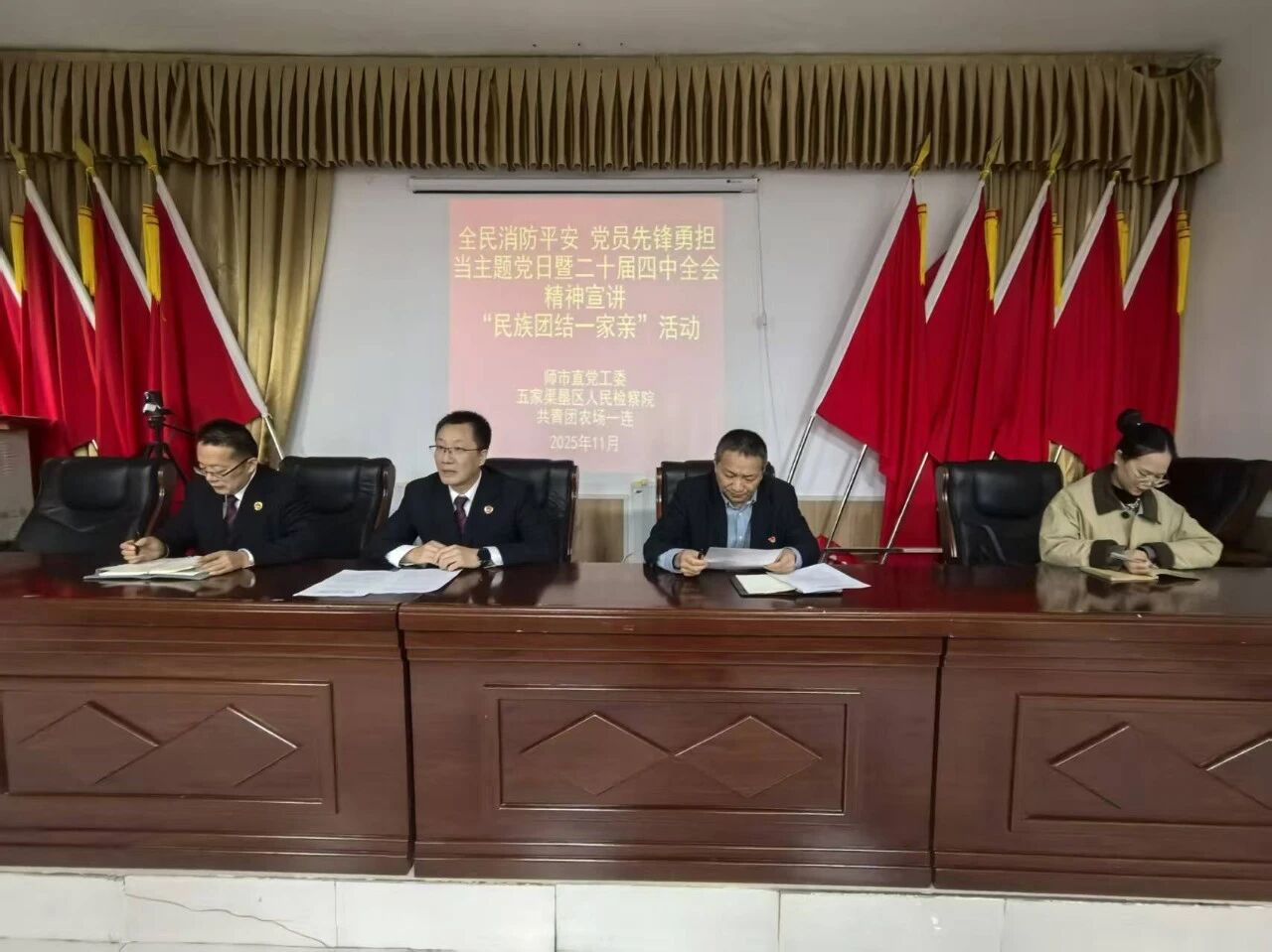 为持续巩固和发展民族团结进步良好局面,深入基层连队服务职工群众,11月21日,五家渠垦区(市)人民检察院组织干警,由党组书记、检察长刘学良带队,前往共青团农场一连,与结对认亲的连队职工共同开展了“亮剑雄师党旗红”主题党日暨“民族团结一家亲”活动,并结合“全国消防宣传月”向连队职工普及了消防安全知识。活动还邀请了师市党委直属机关工委和五家渠北海街消防救援站的同志。