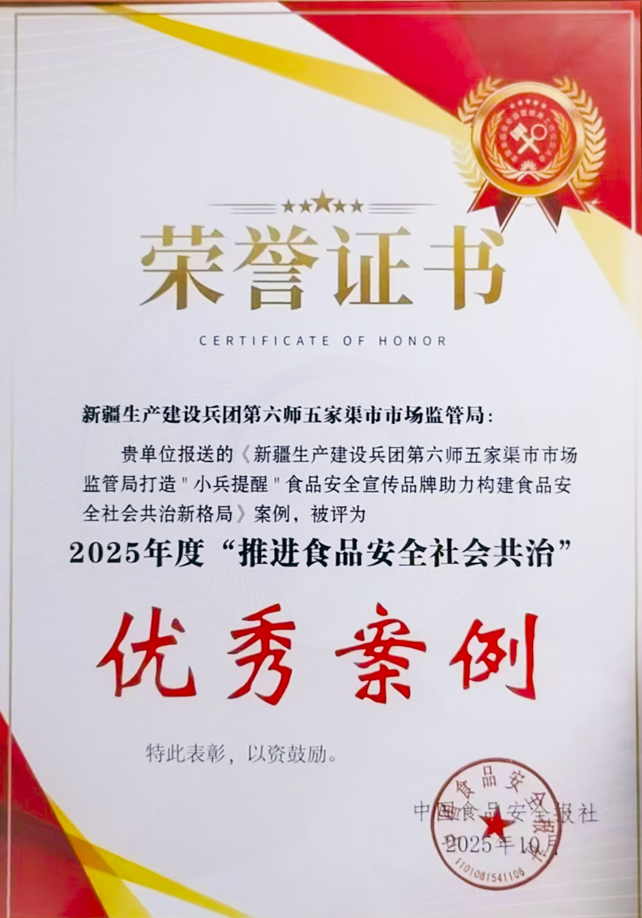 第六师五家渠市市场监管局精心打造的“小兵提醒”食品安全宣传品牌,荣获中国食品安全报社2025年度“推进食品安全社会共治”优秀案例殊荣!
