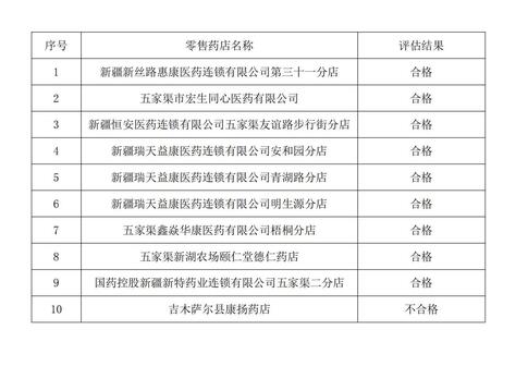 近期,第六师医疗保障事业管理中心组成实地评估小组,对新疆新丝路惠康医药连锁有限公司第三十一分店等10家零售药店申请开通医保联网结算服务相关事项展开实地评估,现将本次评估结果公示如下: