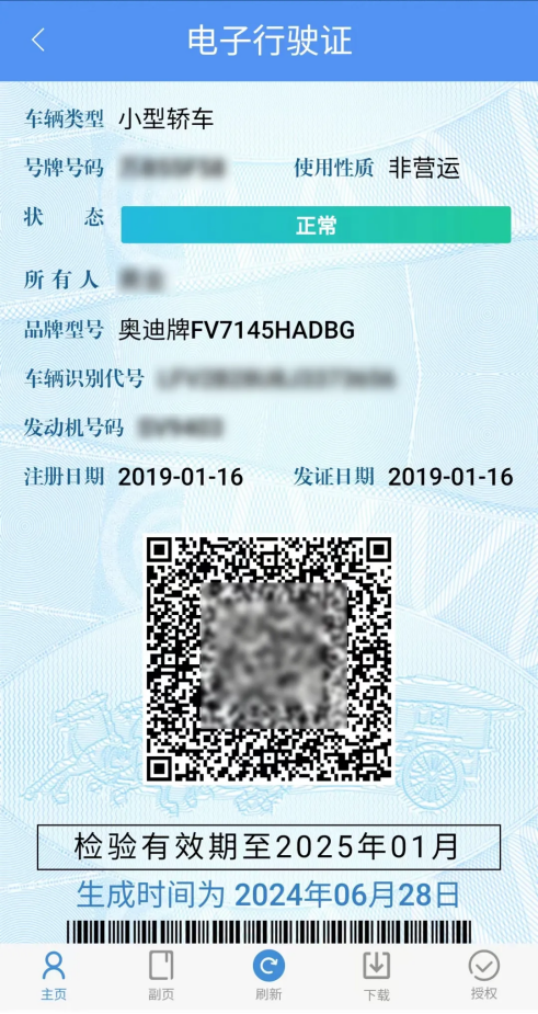 点击电子行驶证下方【下载】按钮,本人直接出示的填写用途事项和有效期后下载,授权出示的直接下载。下载的电子行驶证加注使用人、用途事项和有效期限水印,有效期最长为7个工作日。