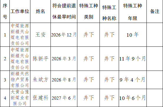 根据特殊工种提前退休有关工作要求,现对特殊工种提前退休申报合格人员进行公示,公示期限5个工作日(自2026年2月27日至 2026年3月4日),如有异议,请在公示期内向兵师人力资源和社会保障局举报。本公示不作为特殊工种提前退休最终审核结果。