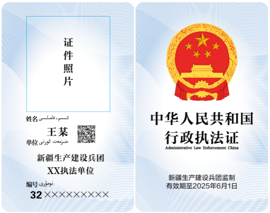 行政执法证1人1号,样式统一为:外套为黑色皮质插卡式,封皮印有中华人民共和国国徽图案、中华人民共和国行政执法证字样;内芯为PVC卡,正面印有持证人员照片,载明持证人员姓名、工作单位、编号;背面印有新疆生产建设兵团监制、有效期字样。证件正面印有二维码,可通过手机扫描查询证件登记信息。