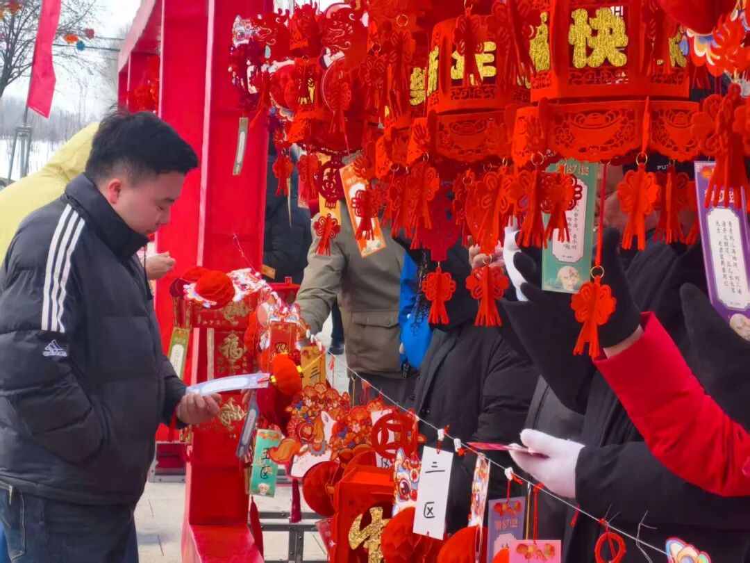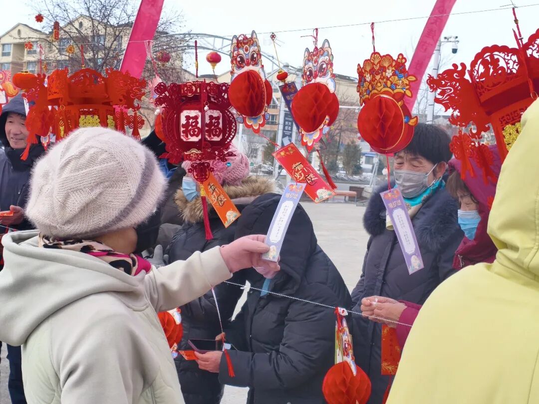 与此同时,“上元灯会·趣猜灯谜”活动同步开展,成为现场最具人气的环节。200条精心设计的灯谜悬挂在灯笼下方,内容涵盖历史文化、民俗风情、生活常识等多个领域,兼具趣味性与知识性,既适合孩童参与,也能满足成年人的挑战欲,充分兼顾不同年龄段群众的参与需求。