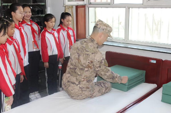 刚入军营,学生们眼神中写满了崇拜和好奇。活动中,同学们近距离观摩了武警部队官兵队列、擒敌术表演,参观了官兵内务和部队荣誉室。同学们被武警官兵整齐划一的队列训练,一招制敌的擒拿动作所折服。同时还积极踊跃地体验了将柔软的被子变成“豆腐块”的神奇。武警部队专门安排了同学们和战士们共同聆听了一堂爱国主义专场教育课。
