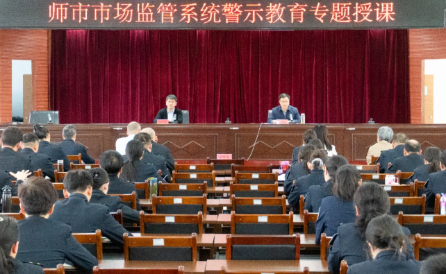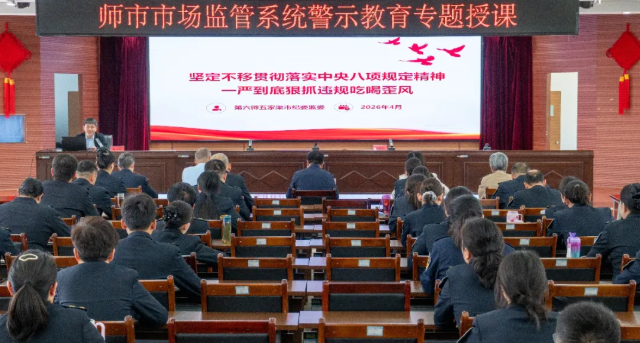 为进一步筑牢党员干部纪律防线,扎实推进违规吃喝专项整治工作走深走实,4月21日,师市市场监督管理局邀请师市纪委领导围绕“贯彻落实中央八项规定精神 狠抓违规吃喝歪风”作专题授课指导。局党组书记宋保勇主持会议,班子成员、机关各科室、各所(队)、事业单位全体党员干部参加会议。