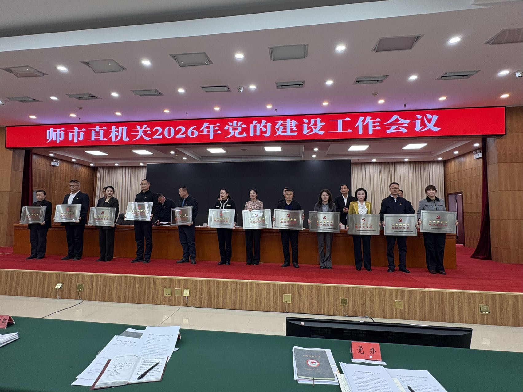 会上,阮重阳同志宣读《关于命名2025年师市直机关星级党支部的决定》和《关于命名2025年师市直机关党建示范点的通报》。文件明确,2025年师市直机关共评定72个星级基层党支部,其中五星级党支部22个、四星级党支部39个、三星级党支部11个;命名9个党建示范点。根据命名结果,会议现场为师市纪委监委党总支机关第一党支部等12个五星级党支部、五家渠市政协机关党支部等9个党建示范点举行授牌仪式。此次授牌既是对2025年机关党建工作成效的集中展示,也为各基层党组织树立了对标学习的先进典型,进一步营造了比学赶超、争创一流的浓厚党建工作氛围。