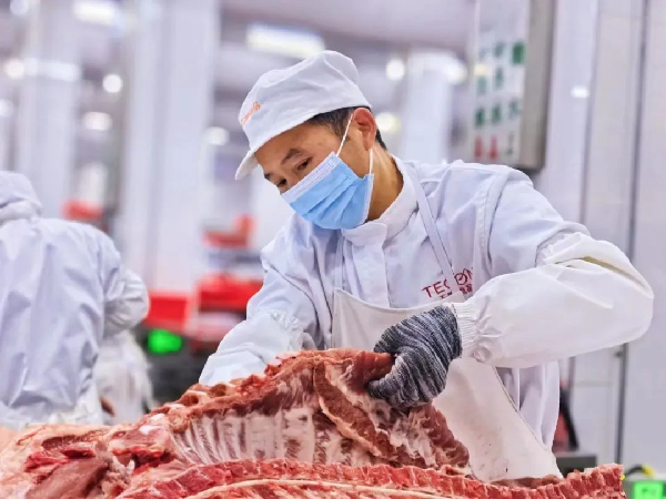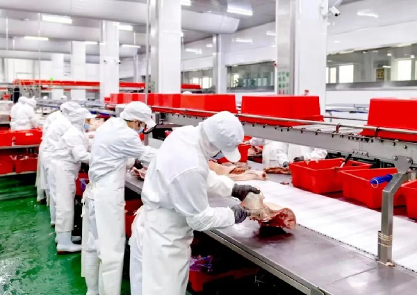 12月23日,在新疆青湖天康食品有限公司厂区内,一辆辆装载运输的车辆来回穿梭,一条条现代化生产线高速运转,一头头生猪经过分割处理后,被送入冷库……